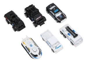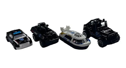• Pack of 4 die cast police-themed vehicles with moving wheels